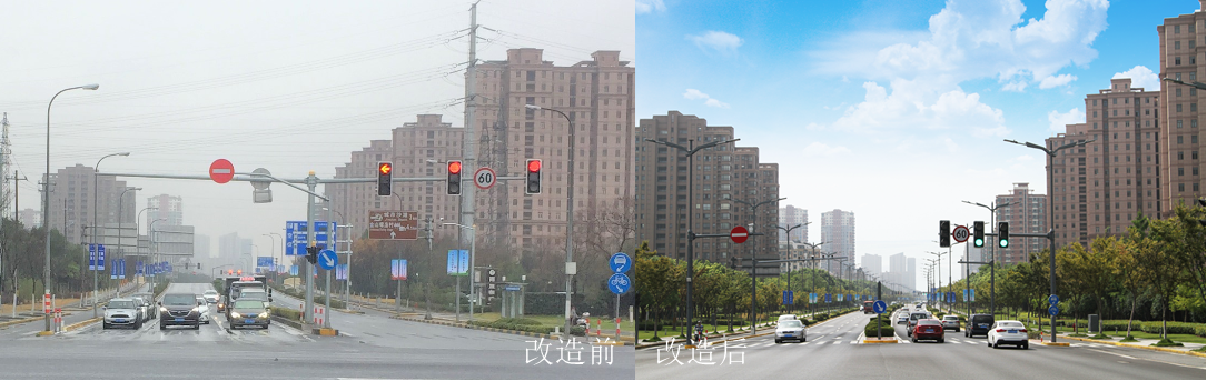 經過各部門的共同努力,杭州灣大道上林立的各式路名牌、信號燈等桿件逐漸合并,煥然一新,達到了“線清、桿合、景美”的效果。