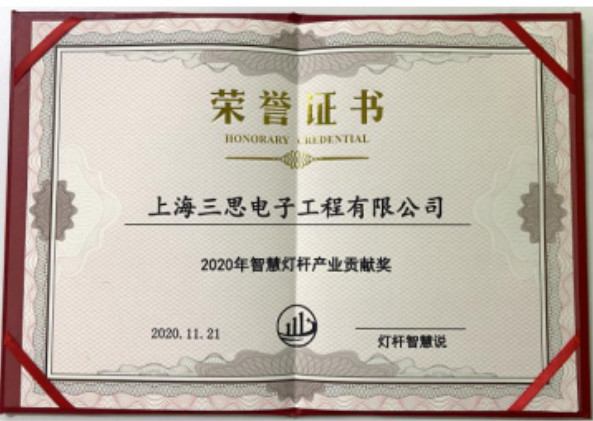 在頒獎儀式上,上海三思獲“2020智慧燈桿產業貢獻獎”,該獎項是對深耕智慧路燈行業多年企業的肯定和鼓舞,對上海三思為智慧燈桿產業發展做出積極貢獻的褒獎。